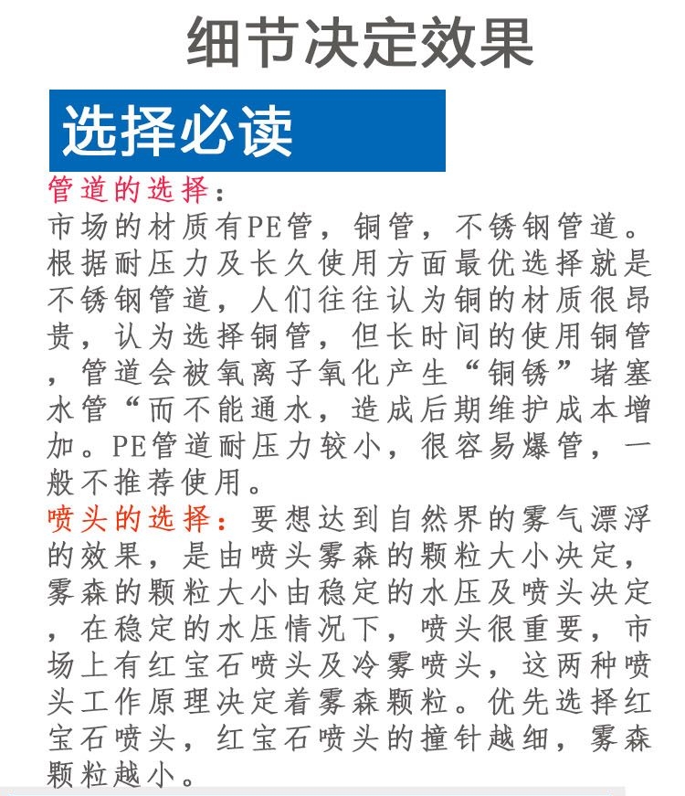 • 专注雾森人造冷雾,冷喷泉,除尘降温,溉灌微喷等工程用不锈钢高压管,解决铜管生氯添堵高成本等难题!引领雾森人造冷雾,喷雾,喷泉喷灌,加湿降温除尘园林景观等行业的新主流材料!